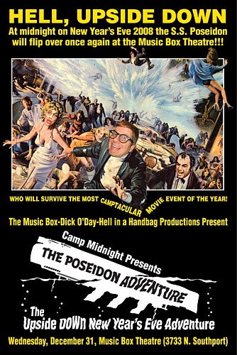 | The Camp Midnight initial 2008 presentation of The Poseidon Adventure (we're talkin' the 1972 camp classic now) hosted by Mr. O'Day and featuring hilarious performances from the Hell in a Handbag theatrical troupe on December 31 at the Music Box Theatre was so fatabulous it has become an annual New Year's Eve tradition. Join us for NYE 2011!!! DETAILS COMING THIS FALL! |