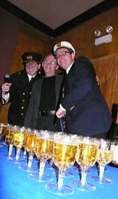 | Captain Dick with his personal first mate Jim and darling Derek who presided over the champagne bar which thirsty guests slurped down like dying fish! |